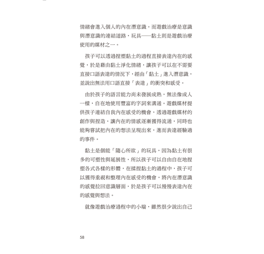 本書亦是諮商輔導、家庭教育與助人工作者的小小工具書,遊戲媒材可以突破孩子在輔導歷程的口語限制,且讓孩子較自在地舒緩情緒、引導思考與表達想法;而不同遊戲媒材亦有獨特的療效,助人工作者挑選適當的媒材能協助孩子不同情境的處遇,更貼近孩子的輔導需求與目標,進而協助孩子走過困境,例如孩子焦慮時刻即可以搭配黏土的表達性媒材以舒緩情緒、孩子容易害怕而逃避即可以使用蜘蛛或鱷魚的恐懼類玩具來陪伴孩子以面對害怕情境;遊戲媒材能延伸輔導療效至孩子的生活情境,專業人員可以鼓勵家長選擇適當的媒材以陪伴孩子在家庭中的使用,達到輔導歷程與生活情境的連結而延續輔導的改變。期待本書能夠帶給助人工作者不同的思考脈絡,並成為助人工作者進行家長諮詢的使用手冊。