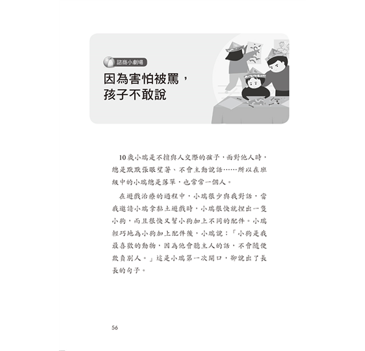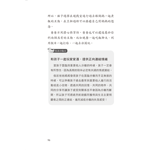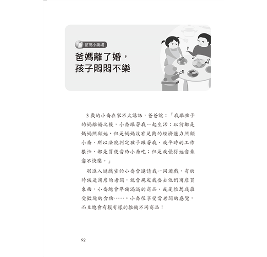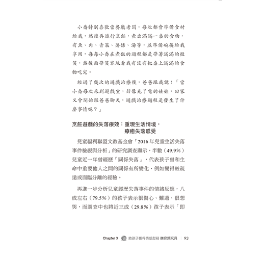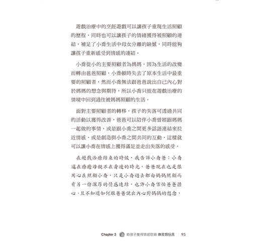 本書透過「遊戲治療小劇場」以故事情境協助爸爸媽媽理解孩子情緒的困境、說明情緒困擾背後的成因,以及如何使用遊戲媒材來協助孩子的情緒調適、挫折容忍力、道德品格發展。