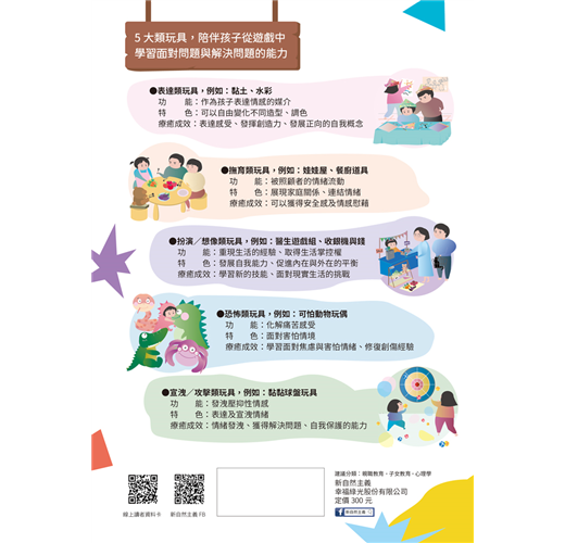 ◆針對表達類、撫育類、扮演類、恐怖類及宣洩類等五大類玩具,深入淺出說明功能、特色與成效,成為與孩子情緒調適的橋梁,本書是父母陪伴孩子心理成長與使用遊戲媒材的重要指南。