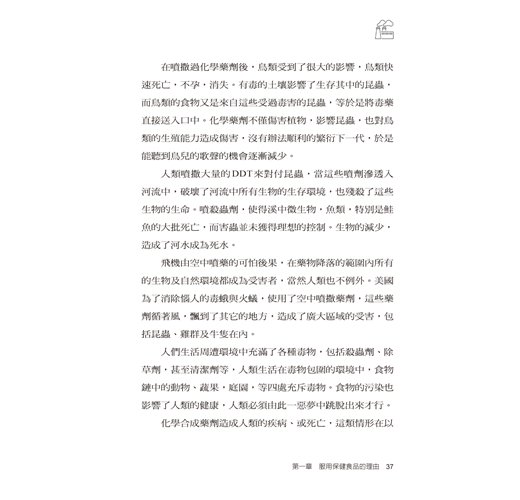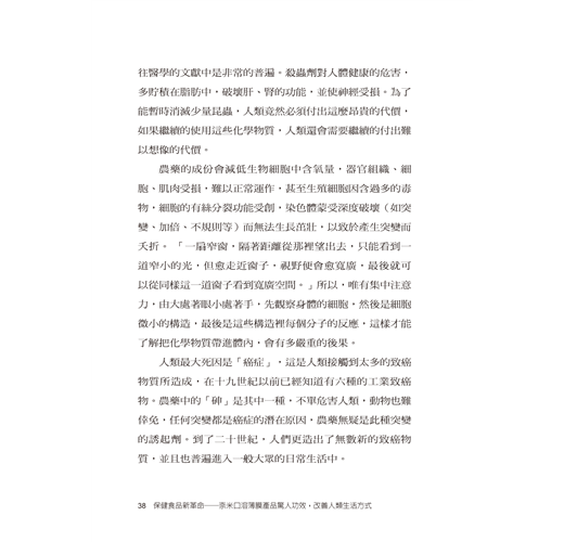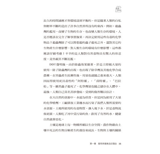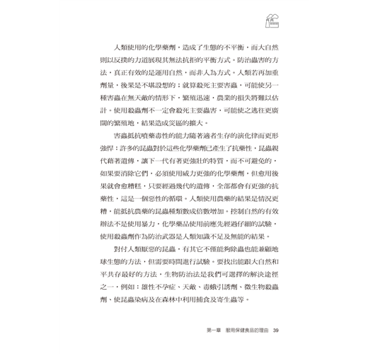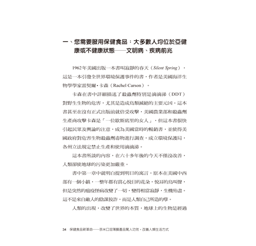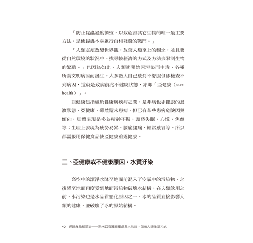 書中保健食品的演進可瞭解到近期科學家研究重點,在如何將營養素傳遞技術以提升吸收效率,科學家提供安全並且快速吸收的營養傳遞技術,應用在保健食品中,嘉惠民眾食用時的便利性。