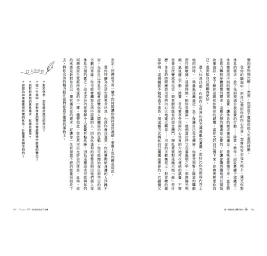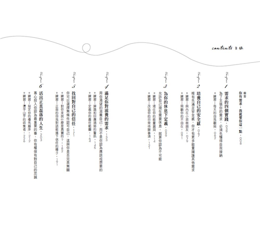 本書內容豐富細緻,從人的九個需求面切入,逐步講述如何照顧自己的需求。每章都有練習欄位與大量提問,讓你能以最適合自己的方式,構築永不動搖的安全感與歸屬感。
