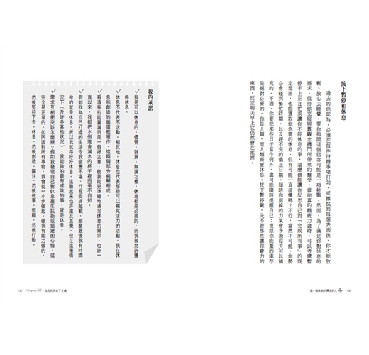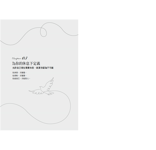 假如你感同身受,請聽取我的建議:你不僅需要休息,還必須休息。你的疲憊是理所當然的。你本身沒有任何錯。你是一個生活在晚期資本主義的人,社會制約使你相信,你最寶貴的地方就是為他人做出的成就和貢獻。甚至可能有人會教導你,放棄你的休息來照顧其他人是正確且最佳的做法。你會需要時間去消除所有驅動你追求無限生產力的那些說法,當然,調整你與自己的對話也相當耗神。因此,首先你一定要休息。不過,究竟怎樣才叫做「休息」呢?