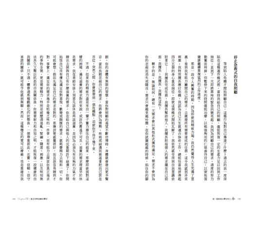 我們第一個孩子出生才剛滿四個月,我的需求多到像水壺沸溢,但我能用來思考生活瑣事的時間與空間卻少得可憐。過去我習慣遮掩真正的自己,不讓身邊的人發現,只為了避免給他們帶來負擔。這是我學會的功課,因為我這一生老是被說太難搞──太有抱負、太高大、太多話、太多感情、太多需求;再加上僵硬的社會制約總會規範一名好女人應有的模樣,這使我學會在所有待辦事情完成後,沒人需要我的難得片刻裡,我才會利用剩餘時間照顧自己。