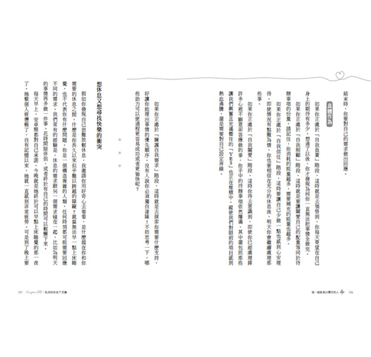 你是一個有自主權的人類,不是一個機器人。這一生,你幾乎可以做任何事,但你沒能力去做所有事──一定也無法同時執行所有事。請你一天撥出五分鐘照顧自己,都可能需要你對某件事說「不」才有可能,即使那個回絕對象是你自己。很多人都感覺到,自己的人生似乎被塞滿了,卻不確定情況是如何或為何會變成這樣。當我們想說「不」的時候,我們可能習慣性地說「好」,因為我們不給自己說不的選擇,以為那個「不」將會使我們變得比較沒用、不被愛或者沒價值。但是,每次我們想說「不」卻說「好」的時候,無形中就強化一個觀念:唯有當我們取悅他人、迎合他們的需求勝過自己的,或者為他們的難受負責時,我們才稱得上是有價值。這麼做顯然是在直接告訴自己──我們不如身邊其他人那麼重要,我們的自主權需要奮力爭奪。