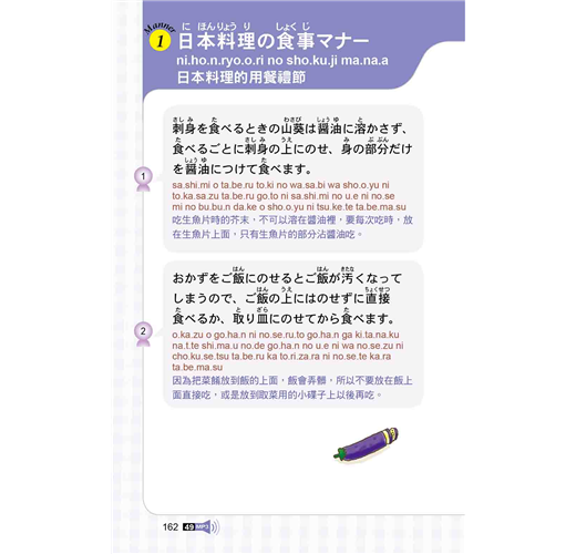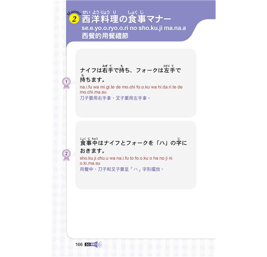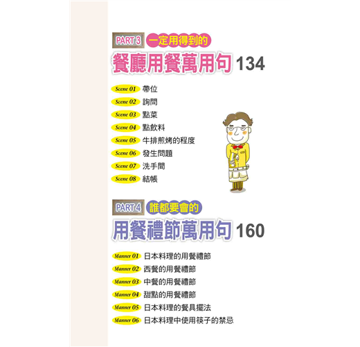 1.六大類各式用餐主題,不僅讓您同時學會日本料理、西餐和中餐等等的用餐規矩,也在不知不覺中學會其日文說法!