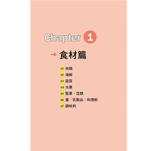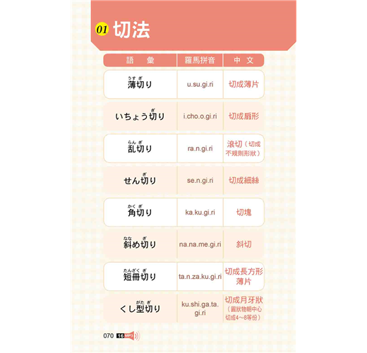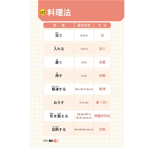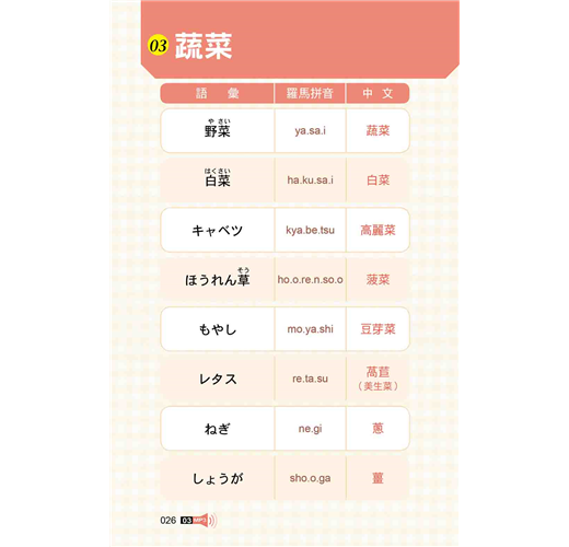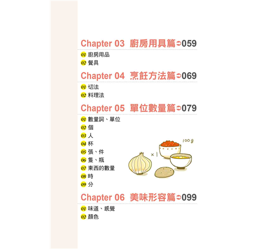 「食材篇」、「美食篇」、「廚房用具篇」、「烹飪方法篇」、「單位數量篇」、「美味形容篇」,每個主題皆羅列出各種相關單字,日本市場裡看得到的蔬果、烹飪教室中使用的器具,這裡全都可以找得到!