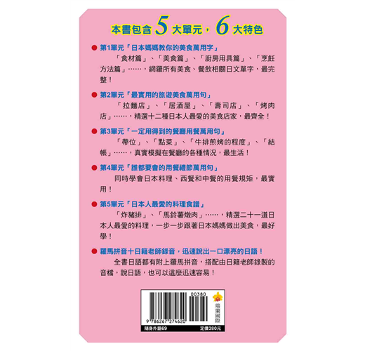 「想說日語,可是記不起來」、「喜歡吃美食」、「想試著做做看日本的家庭料理」,針對這樣的人的【好吃的書】,就此誕生!本書雖然只是簡單的萬用句,卻是把品味日本必備且派得上用場的日文通通集結在一起的好書。您完全不需要拚命死背。經常帶在身邊,需要的時候就拿出來用吧!