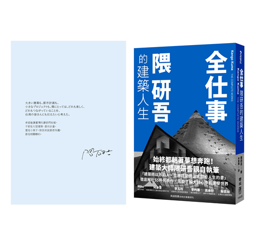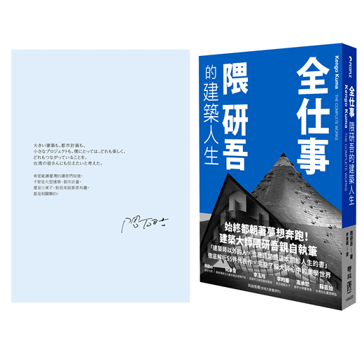 《全仕事》不僅記錄了他對建築的想法,同時也是他完成工作後的自我省思,更是他重新梳理截至今日職人生涯的回首。曾經年少,衝撞體制創造實驗性極強的作品,到如今更關懷人與人之間、自然與永續的未來。