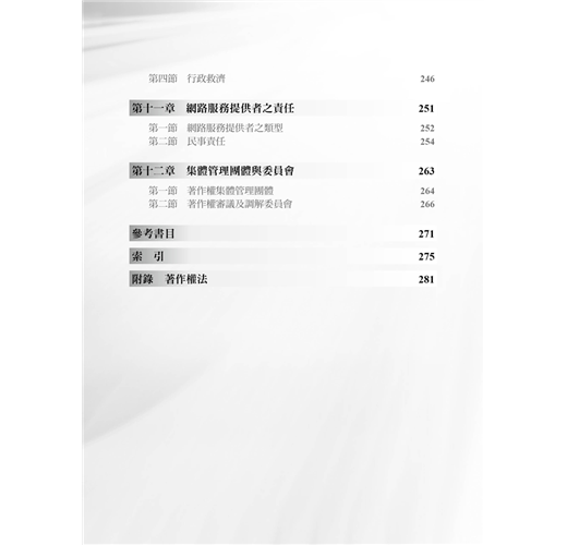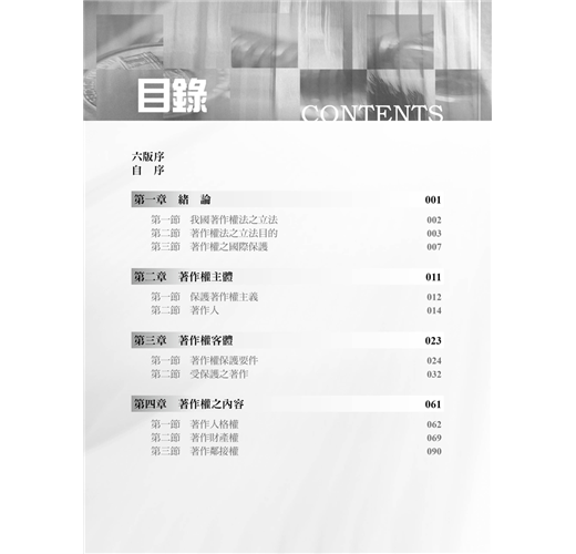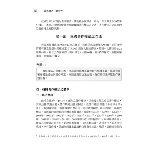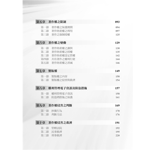 作者從事民事審判逾20年,本於教學及實務之經驗,本諸國內、外學說、實務見解及審判經驗,將本書內容分為緒論、著作權主體、著作權客體、著作權內容、著作權限制、著作權變動、製版權、權利管理電子資訊及防盜措施、著作權侵害之判斷、著作權侵害之救濟、網路服務提供者之責任、集體管理團體與委員會等12章,為總括及系統化之解說,並以例題之方式,說明及分析法律之原則,使實務與理論相互印證,將著作權法理論轉化成實用之學。本書為使考生知悉國家考試之方向,茲將歷屆考題出處標示於內文,俾於掌握研讀重心。再者,本書計有案例82題,先於介紹各章節理論之前,先提出例題,使讀者產生問題意識,繼而說明及分析原理,最後解析例題解答,俾於有志研習者除能全面瞭解著作權法原理原則外,亦可應用於實際之具體個案,期能增進學習效果及實務運作。