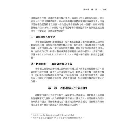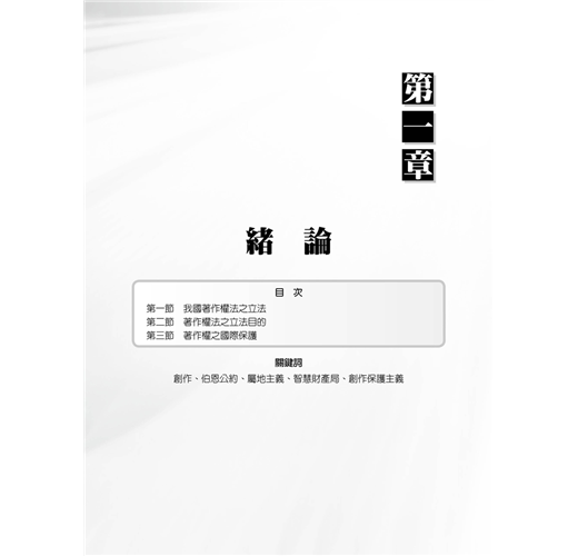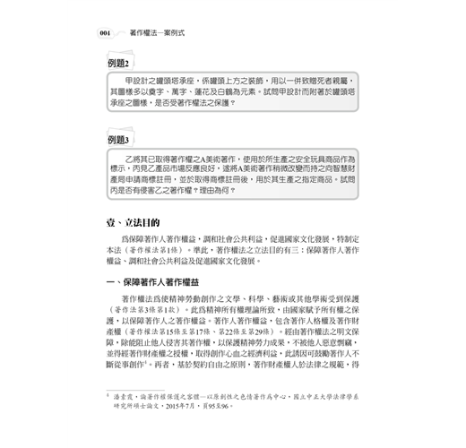 著作權法所稱著作,係表現出作者之獨特性及須有原創性之精神上創作。我國著作權法就著作權之本質採二元說,認為著作權包含著作人格權與著作財產權。前者有公開發表權、姓名表示權及不當變更禁止權;後者可分有形利用權、無形傳達權及改作與編輯權。著作權為智慧財產權領域之一環,以保護文藝性與文化性之精神活動成果為目的,為有價值之權利與財富,自應受法律之保護。因各類著作存在各領域,是著作權與人民日常生活有密切之關連,是欲掌握著作權法之規範重點,而正確解釋及適用法律,將著作權法理論應用於實際之具體事件,就法律人而言,誠有重要之課題。