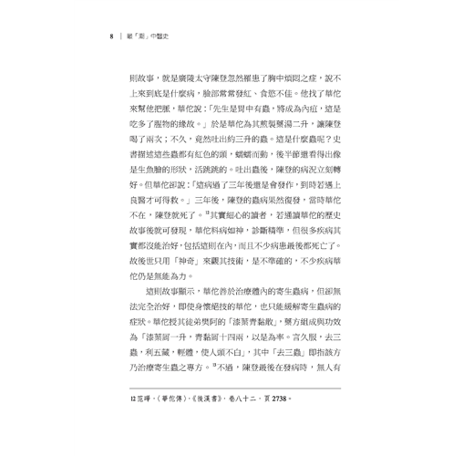 本書寫作題材包羅萬象,上至神醫華佗、針灸穴道,下至民俗食療、刮痧放血,沒有生僻冷硬的歷史,只有你想像不到的各種有趣故事!不僅內容極具延伸研究價值和閱讀趣味性,同時收錄了醫療史研究方法及總體視野的文章,是一本既符合大眾史學寫作精神,卻又不失嚴謹學術性的醫療史讀本。