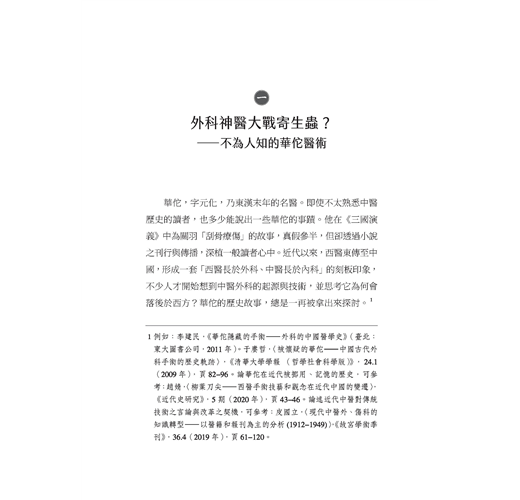 換個角度來思考,若能從科普、史普的角度來思考高中生、大學生,乃至是醫學院學生之需求,讓那些對中國醫學人文與身體觀有興趣的年輕讀者,在日常閱讀上能擁有一本不那麼生硬難懂的歷史讀本,應有其必要性。我一度認為,山高水深,學術書大概本來就不是訴求讓一般人讀得懂的,專業論文和專書是給極少數同領域的專家來審查、升等用的工具,但將知識轉譯給更多讀者知曉,彰顯人文價值,難道不應該有學者參與其中?事實上,很少學者會注意到一般讀者的閱讀需求,思考生產有趣的故事以饗更廣泛的讀者群。那麼,如果我們不邁開腳步來嘗試歷史學的非虛構寫作,導致人文學中長期缺乏思想與大眾心靈之對話、接觸,僅尋求孤芳自賞,那又何以稱為「人」文呢?值得當代學者省思。