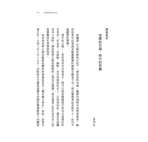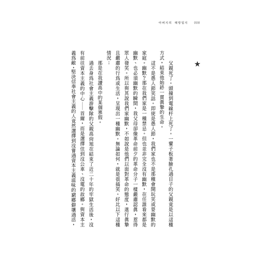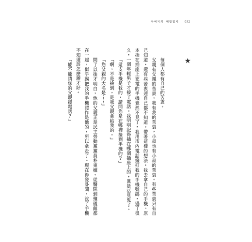 ‧我其實從沒想過自己是什麼樣的女兒,或者應該成為什麼樣的女兒,我一直只糾結在自己是誰的女兒這一點。為了擺脫身為游擊隊員的女兒這一泥淖,我一生都在掙扎,現在也並無不同。游擊隊員的女兒這說法要能成立,前提是父母得是游擊隊員。可是,正如子女對父母會有所期待一樣,父母也會對子女抱有期待。但是我連想都沒想過這點,只顧著反抗爭辯游擊隊員女兒這個枷鎖太過沉重。但是希望他能聽到這些爭辯的父親已經過世了,對我而言,爭辯的機會也於焉消失。這個事實讓我心痛,痛到我第一次哭出聲來。不是為父親哭,而是為我自己哭。