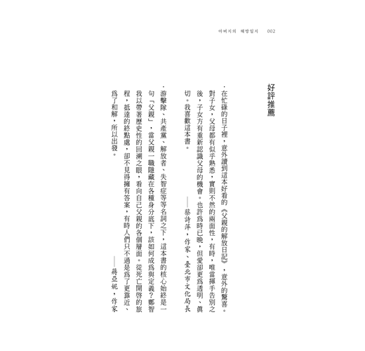 ‧在忙碌的日子裡,意外讀到這本好看的《父親的解放日記》,意外的驚喜。對子女,父母都有似乎熟悉,實則不然的兩面性,有時,唯當揮手告別之後,子女方有重新認識父母的機會。也許為時已晚,但愛卻更為透明、真切。我喜歡這本書。──蔡詩萍,作家、台北市文化局長