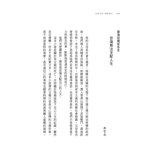 ‧游擊隊、共產黨、解放者、失智症等等名詞之下,這本書的核心始終是一句「父親」,當父親一職隱藏在各種身分底下,該如何成為與定義?鄭智我以帶著歷史性的回溯之眼,看向自己父親的各個層面。從死亡開啟的旅程,抵達的終點處,卻不見得擁有答案,有時人們只不過是為了更靠近、為了和解,所以出發。──蔣亞妮,作家