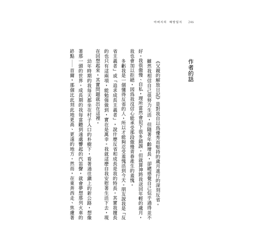 ‧奇怪的是,父親的遺照卻讓我想起那些令我深深懷念的親密回憶。也是直到此刻,父親去世之後,他才不是游擊隊員,而是我的父親,小時候那個曾經無比親近的父親似乎復活了。我想,死亡不是結束,人生就是經由死亡,在某些人的記憶中復活。因此,和解或寬恕也是有可能的。