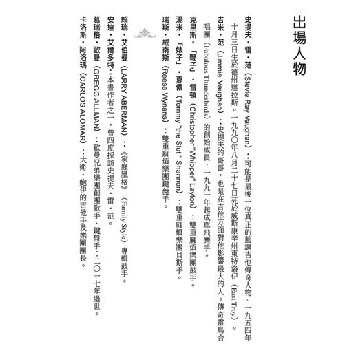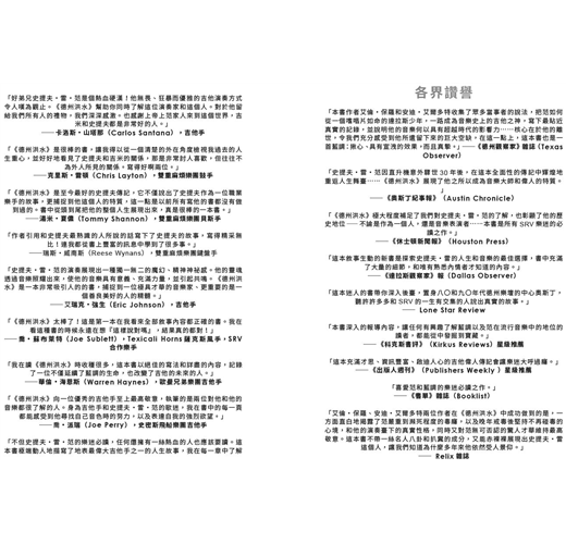「這本迷人的書帶你深入後臺,置身八〇和九〇年代德州樂壇的中心奧斯丁,聽許許多多和SRV的一生有交集的人說出真實的故事。」 --Lone Star Review