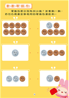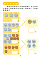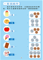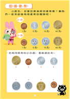 書中附有48張硬幣圖卡及27張紙鈔圖卡,讓孩子在練習計算時使用,也可應用於購物遊戲的親子互動上,這樣反覆練習,逐漸建立孩子的金錢觀,並學會正確的運用方式,之後就可以試著在商店實際購物,學習主動思考及行為獨立。