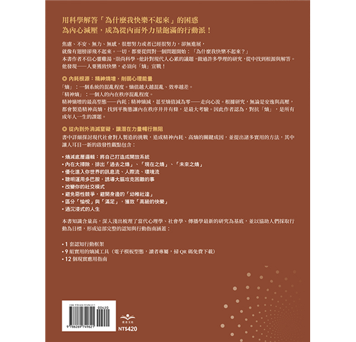 本書作者不信心靈雞湯,崇尚科學。他針對現代人心累的議題,做過許多學理的研究,從中找到根源與解答。他發現——人要獲致快樂,必須向「熵」宣戰!