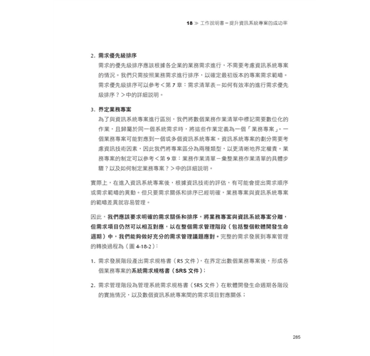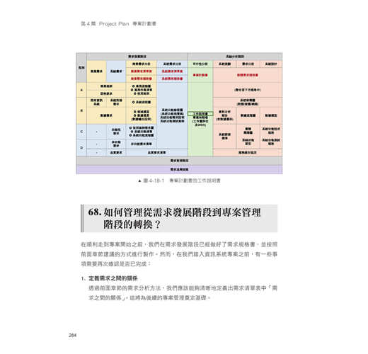 專注於專案計劃,列出了與需求管理密切相關的部分,目的是幫助讀者順利將需求分析結果轉化為具體的專案工作任務。