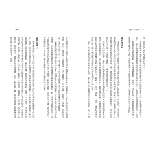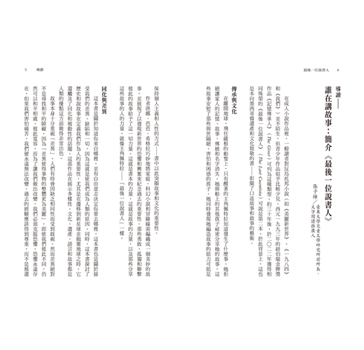 讀者將在《最後一位說書人》中找到一個承諾:過去並不是未來的敵人,而是一份禮物,賦予了我們以同理和勇氣迎接未來。——《書頁》雜誌Bookpage