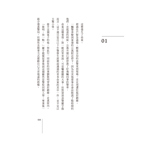 「敬明,快一點。」羅宇龍催促著後面這個雖然是警校同期入學,畢業後一起分發進警局,但個性及做事方式都跟自己天差地遠的搭檔。