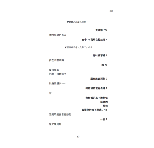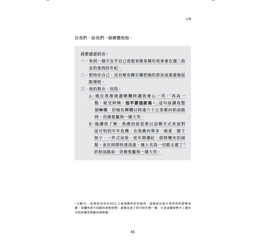 不,我說的這裡指的是我生日快到了,我就快要變成四十幾歲了,而一切都不是我以前想像的那樣。我的意思是,這一切是怎麼發生的?就像我在某個地方忘了轉彎一樣,彷彿有個目的地寫著「四十幾歲」,而我的朋友和我全都朝那個方向前進,一手拿著靑春,另一手拿著夢想,滿心期待,人生充滿各種可能性。有點像是你去度假的時候踏出飛機,走下那些移動的通道,咻一聲把你和其他人一起帶走,跟著指示來到行李認領處,渴望看看那些拉門另一側究竟是什麼東西。
