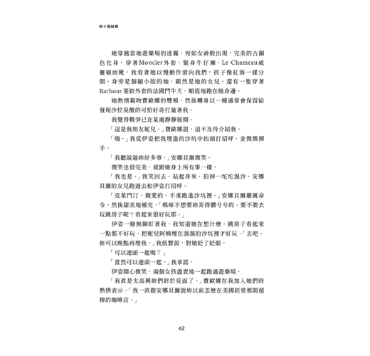 ■ 「這是一個有趣的、好鬥的故事,講述了四十歲時不得不重新開始的高潮和低谷,故事的核心是一個聰明、時髦的人物,你會從頭到尾為之歡呼。」──麥克.蓋爾(Mike Gayle),《承諾先生》作者
