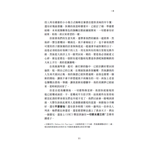 但是自從我離開後,一切都物換星移。我很快就發現房租已經變成兩倍,不,是變成平方倍才對。而我那些有客房和便宜紅酒的單身朋友們也早就不見了,我們以前會一路喝到淸晨,大聲告訴彼此那男人是個徹頭徹尾的混蛋,妳跟他分手剛好,還有不要害怕!還有很多時間!同時一邊列出一長串名人列表,她們都比妳還老,還是都想辦法遇上了眞命天子,擠出一個嬰兒,還登上《OK!》雜誌談論在一切都太遲之前*怎麼奇蹟產子。