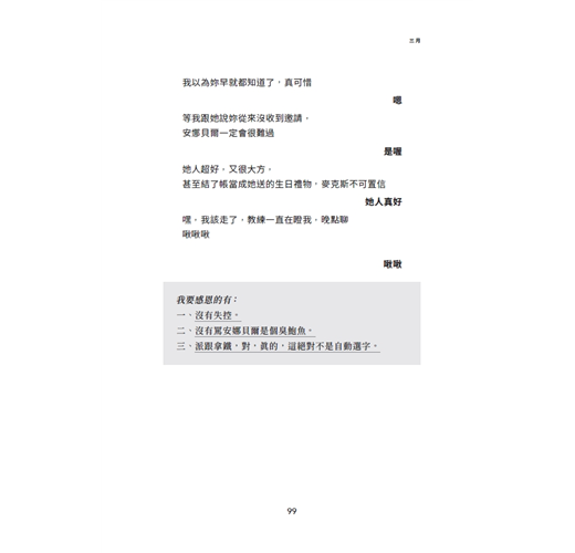 我的目光反倒落在床邊桌上的新筆記本,今天才剛買的,根據我正在讀的某篇文章,快樂的祕密就在於寫下每日的感恩淸單。
