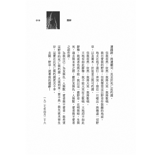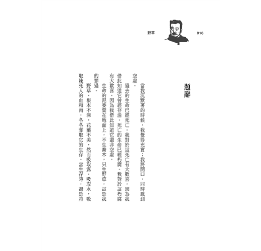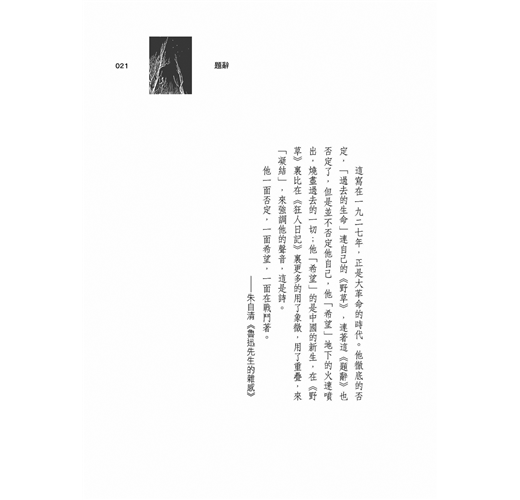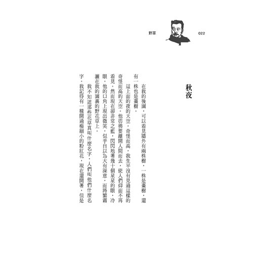 訂購本商品前請務必詳閱退換貨原則。《野草》是魯迅創作生涯中唯一的一部散文詩集,收錄了魯迅在1924~1926年間所寫的散文詩,這些作品包含了魯迅一生的人生哲學,全書以曲折幽晦的象徵手法,表達了魯迅對現實的失望和憤懣,其文筆深沉雋永,意象玄妙奇美,是中國現代詩歌中的經典佳作,同時也是研究魯迅思想的重要資料。
