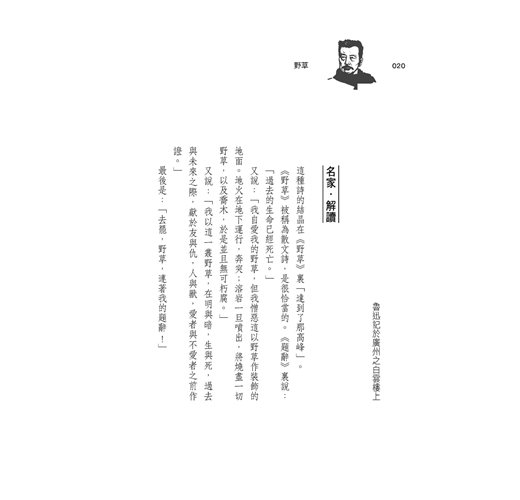 《野草》是魯迅創作生涯中唯一的一部散文詩集,收錄了魯迅在1924~1926年間所寫的散文詩,這些作品包含了魯迅一生的人生哲學,全書以曲折幽晦的象徵手法,表達了魯迅對現實的失望和憤懣,其文筆深沉雋永,意象玄妙奇美,是中國現代詩歌中的經典佳作,同時也是研究魯迅思想的重要資料。