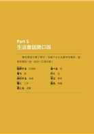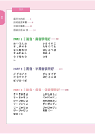 本書共分為五大章節,分別有以「四大學習核心」為架構的「PART 1清音、鼻音學得好」、「PART 2濁音、半濁音學得好」、「PART 3拗音、長音、促音學得好」、「PART 4實用字彙記得牢」,還有「PART 5生活會話開口說」。跟著本書的學習步驟,在「PART 1~3」學習完50音之後,接下來在「PART 4實用字彙記得牢」讓您不知不覺累積龐大字彙量,最後在「Part 5 生活會話開口說」當中學習最實用且最道地的日常生活會話,就能輕鬆開口說日語。詳細內容如下: