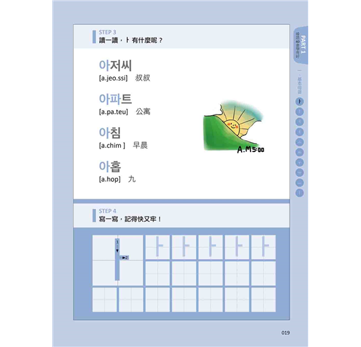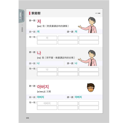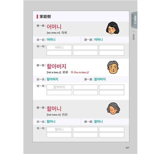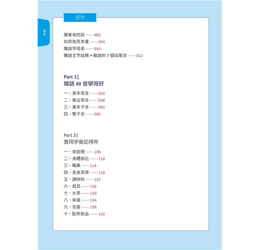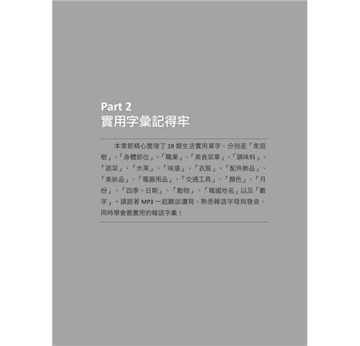 本章節精心整理了19類生活實用單字,分別是「家庭樹」、「身體」、「職業」、「美食菜單」、「調味料」、「蔬菜」、「水果」、「味道」、「衣服」、「配件飾品」、「化妝品」、「電器」、「交通工具」、「顏色」、「時間」、「季節」、「動物」、「韓國地名」以及「數字」。請跟著音檔一起聽說讀寫,熟悉韓語字母與發音,同時學會最實用的韓語字彙!