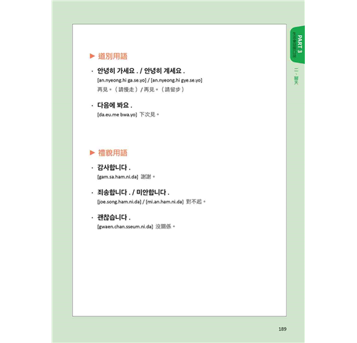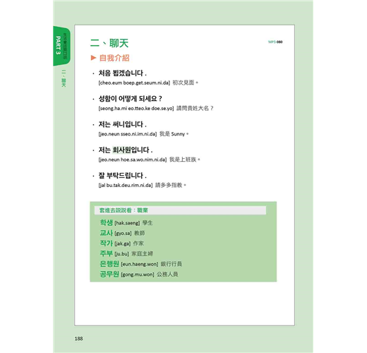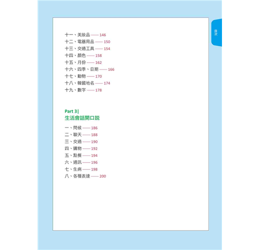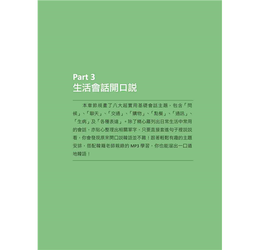 本章節規畫了八大超實用基礎會話主題,包含「問候」、「聊天」、「交通」、「購物」、「點餐」、「通訊」、「生病」及「各種表達」。除了精心羅列出日常生活中常用的會話,亦貼心整理出相關單字,只要直接套進句子裡說說看,你會發現原來開口說韓語並不難!跟著輕鬆有趣的主題安排,搭配韓籍名師親錄的音檔學習,你也能溜出一口道地韓語!