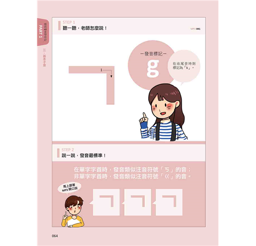 先聽一聽音檔、跟著開口說一說來掌握發音、再讀一讀相關單字加強記憶、最後寫一寫反覆練習。如此循環之下,不僅可鞏固發音基礎、累積單字量,更可同時提升聽、說、讀、寫四大能力: