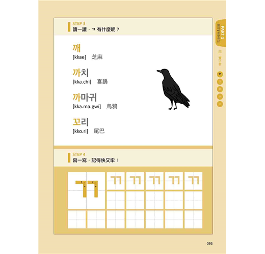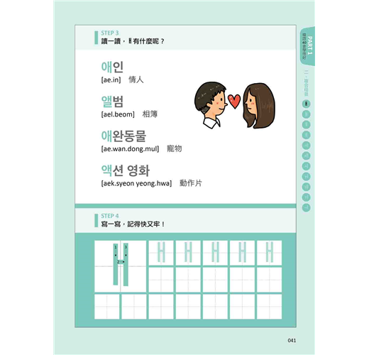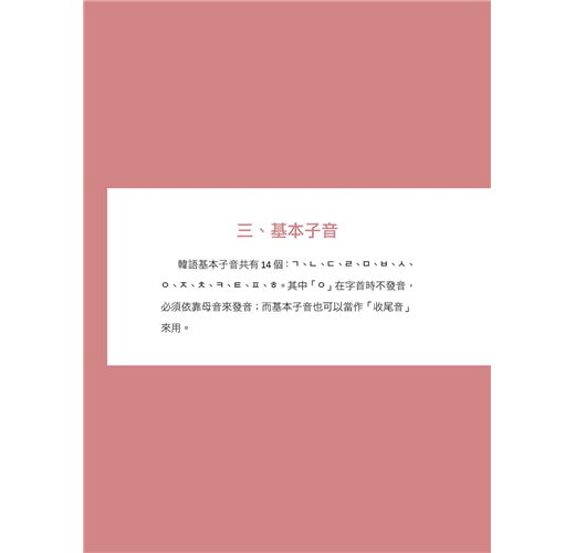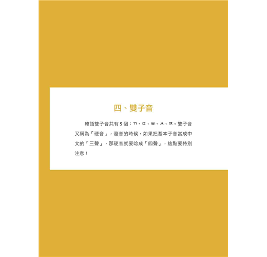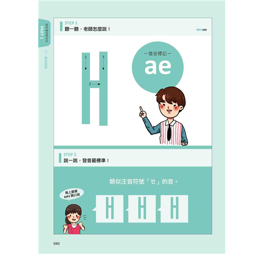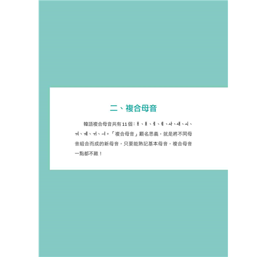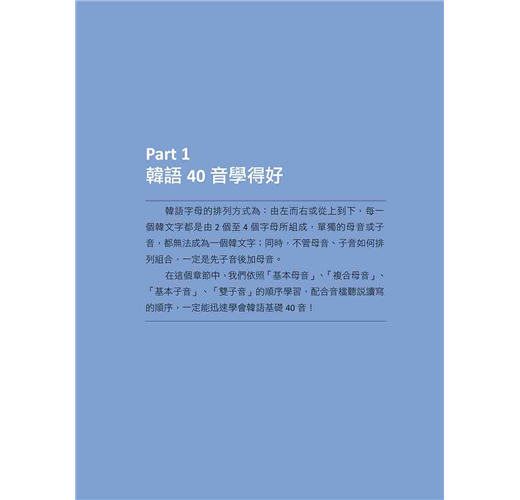 在這個章節中,我們依照「基本母音」、「複合母音」、「基本子音」、「雙子音」的順序學習,搭配音檔聽、說、讀、寫的順序,一定能迅速學會韓語40音!