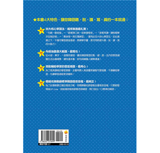 新版的內容除了保有以四大學習核心為架構所編寫的「PART 1韓語40音學得好」、「PART 2實用字彙記得牢」之外,還有「PART 3生活會話開口說」。只要跟著學習步驟,在「PART 1韓語40音學得好」學習完字母之後,接下來在「PART 2實用字彙記得牢」讓您不知不覺累積龐大字彙量,而在「PART 3生活會話開口說」當中學習最實用且最道地的日常生活會話,就能踏穩學習韓語的第一步。此外,以上不管哪個學習步驟,讀者只要運用封面上的QR Code,隨掃即聽,學習將更有效率。