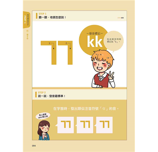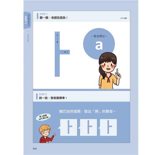 「先聽一聽音檔」→「跟著開口說一說掌握發音」→「接著再讀一讀相關單字加強記憶」→「最後寫一寫反覆練習」,運用此四大核心學習法,如此循環之下,不僅可鞏固發音基礎、累積單字量,更可同時提升聽、說、讀、寫四大能力!