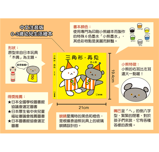 ★全書使用專為印刷小熊繪本設計的特殊6色墨水「小熊墨水」,色彩鮮明飽滿,有助孩子視覺發展