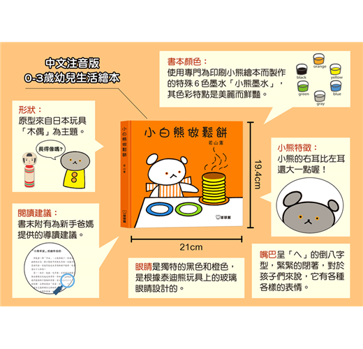 ★全書使用專為印刷小熊繪本設計的特殊6色墨水「小熊墨水」,色彩鮮明飽滿,有助孩子視覺發展