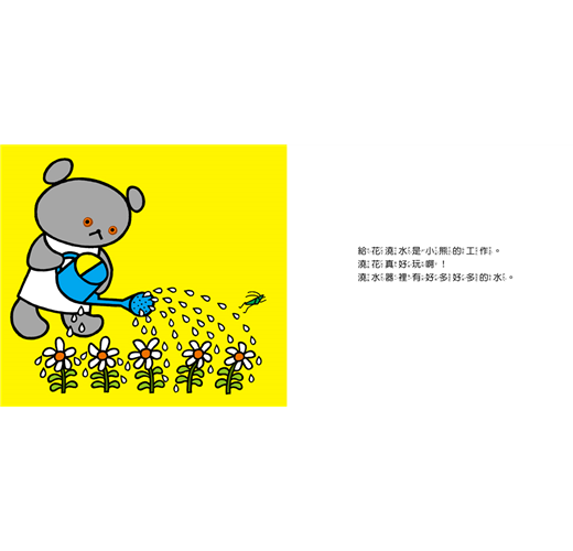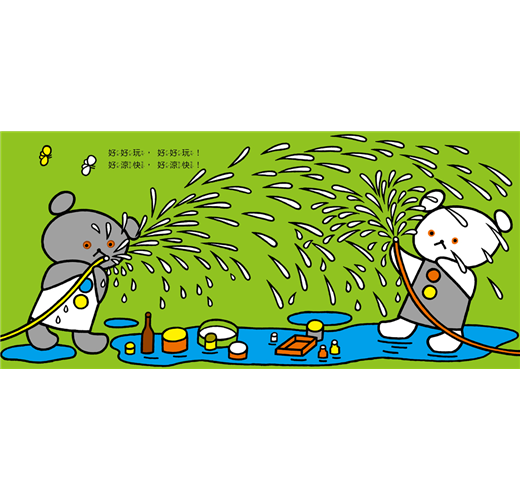 小熊給花澆水變成了給螞蟻澆水,小螞蟻不喜歡水,就用樹葉給它們做船;小白熊看到後也拿起水管來,變成了打水仗!最後身上都是泥巴,就回家洗澡吧!