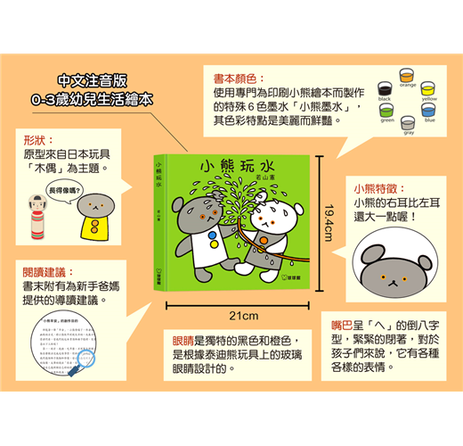 ★全書使用專為印刷小熊繪本設計的特殊6色墨水「小熊墨水」,色彩鮮明飽滿,有助孩子視覺發展