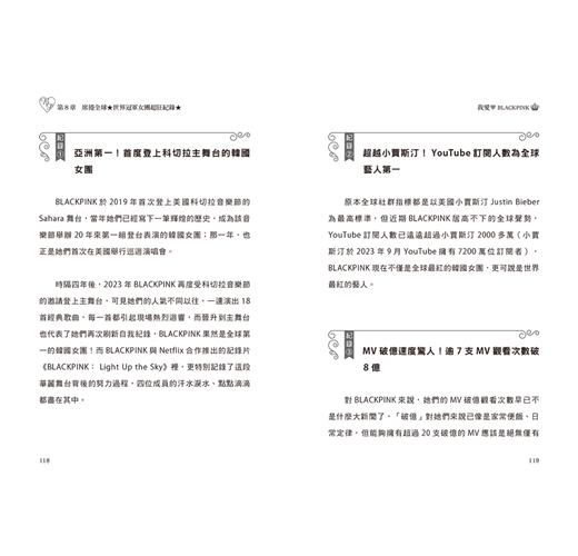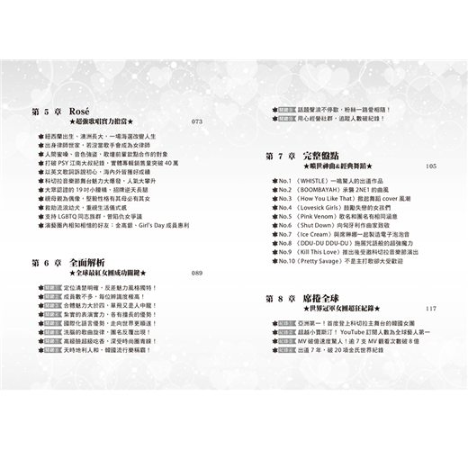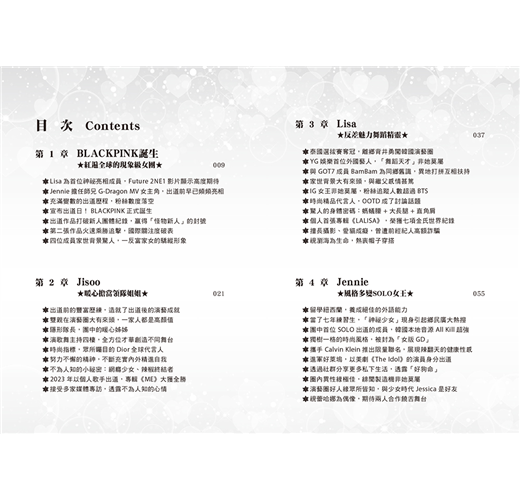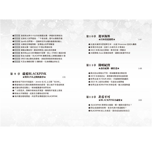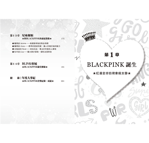 本書帶你一窺世界級女團誕生的成長史,揭開更多成員們私底下的面貌。看她們如何從沒沒無聞的練習生蛻變為紅遍全球的國際巨星,想知道更多關於BLACKPINK相互扶持、共同成長的點點滴滴,所有不容錯過的精采內容通通都在這裡,邀你一同感受BLACKPINK的宇宙星勢力!