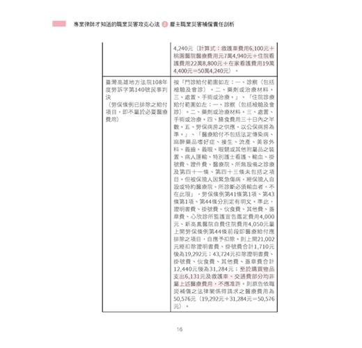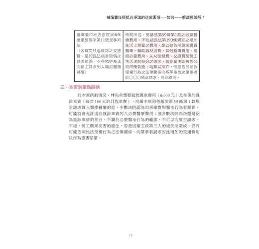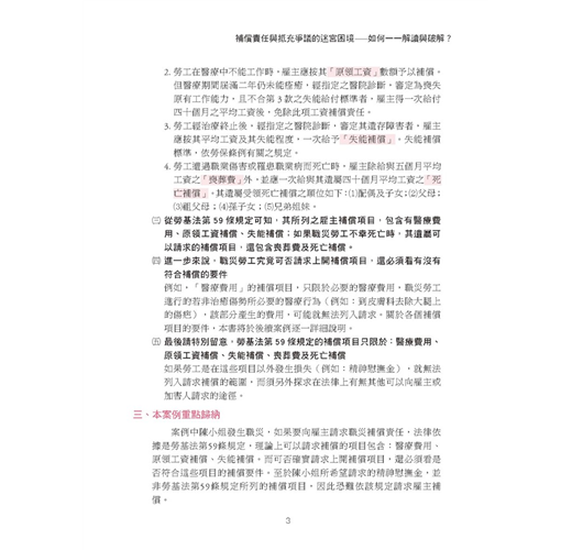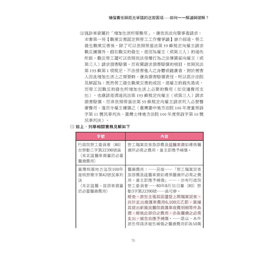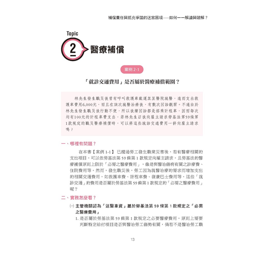 為了處理上述困境,本叢書將職災爭議分門別類,並於各類的爭議下,羅列實務上常會遇到的職災問題,再以問與答之方式,整理了對應的法規以及實務見解。本叢書共計三冊:
