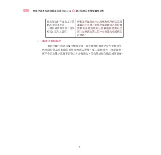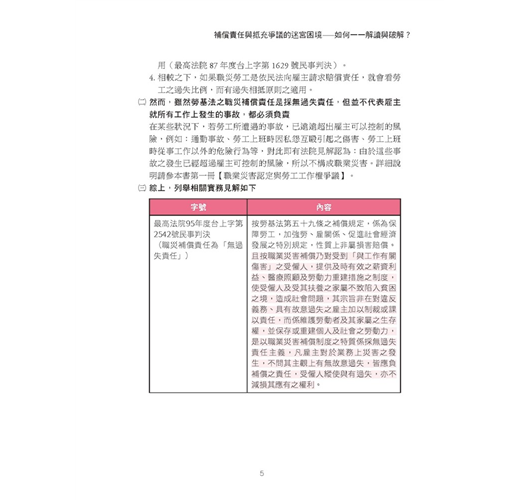 期望藉由本叢書詳盡的說明,使讀者能夠掌握職災相關的法令全貌及實務見解,並且於處理實際案例時,能從本叢書中找到可遵循的方向,而不再無所適從。
