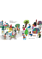 除了上述提及的深層教育意義,這本書也具備繪本獨有的圖畫敘事特色,當成遊戲書來讀更添趣味!建議父母引導孩子找一找書中有幾個時鐘?樹上有幾顆蘋果?說一說這些時鐘分別代表幾點?人們正在做哪些活動?喜歡手作的父母也可以帶著孩子觀察拼貼式的插畫,創造出具個人特色的作品。