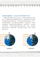 小狐狸說:「在地球表面的中間,有一條假想的圓周線,橫向繞地球一圈,和南北兩極的距離相等,我們叫它『赤道』。靠近赤道的地區,是低緯度地區,那裡長年幾乎都被陽光垂直照射,所以一直處於炎熱的狀態。南北兩極附近,是高緯度地區,陽光幾乎是從很偏斜的角度照射到那裡,所以那裡一直處於寒冷的狀態。在當中的,是中緯度地區,那裡受到陽光照射的角度有點偏又不會太斜,所以冷熱適中,而且四季的變化也比較明顯。」