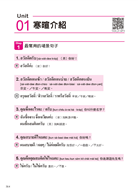 泰文是標音文字,只要認得字母就可以唸得出來,但要唸得道地勢必得學好變音規則。書中發音篇除了教每個母音、子音之外,更把複合子音的內容也列出來。篇章最後收錄的重點,將泰語拼讀、泰語特有的「前引字」及聲調規則濃縮整理出來,少少幾頁就能看懂。讀者若學到後面發現自己唸的怎麼與音檔不同時再翻回來看一下,便能在無形中增加印象。文法篇章裡,作者先以整體架構讓讀者了解泰語有哪些詞性,句子的結構有哪些型態。因為跟泰語跟中文一樣是孤立語系,只要用最簡單的方式介紹,就能一看就懂泰語文法。若能學好這些文法,遇到泰國人時便有能力用簡單的泰文與對方交流。單字篇裡收錄的詞彙全是我們日常生活中會使用到的單字,包括國家城市、家人與稱謂、身體部位、日常用品、數字與日期、時間與金錢等。學完單字之後,將發音、文法、單字結合起來,就能學習文字長度再長一點的日常短句跟會話。經過發音課、文法課、單字課、會話課,就能用簡單的泰語和泰國人溝通了。
