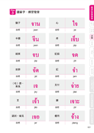 每一個泰文字母除了有嘴型示範及重點提示之外,還用羅馬拼音輔助記憶。加上筆順示範圖及舉例單字記憶,很快就能學會。同章還包括泰文特有「前引字」及聲調說明。